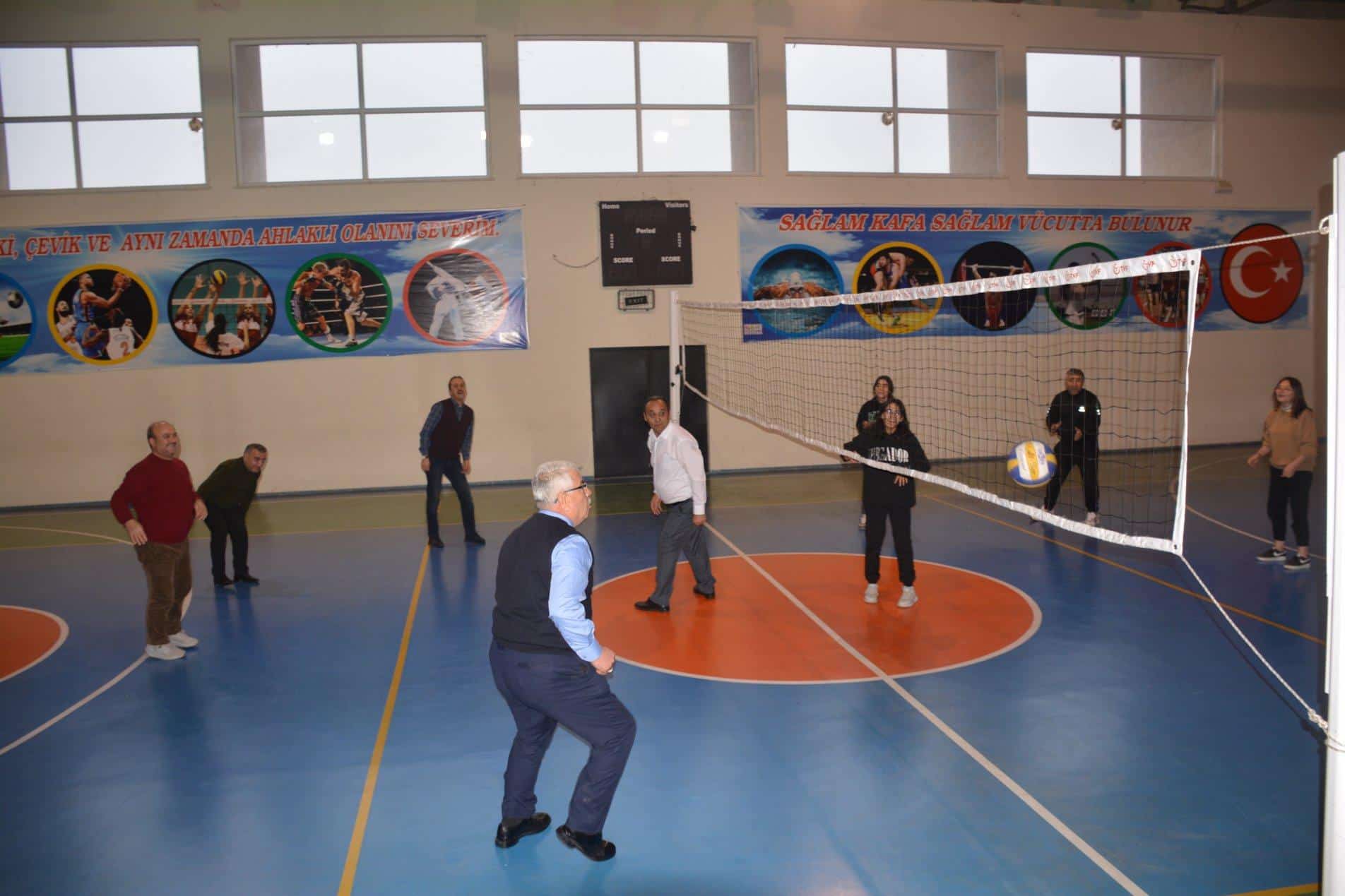 Pansiyonda kalan öğrencilerle kapalı spor salonunda voleybol oynayan Yazıcı, öğrencilerin heyecanlarına ortak oldu.