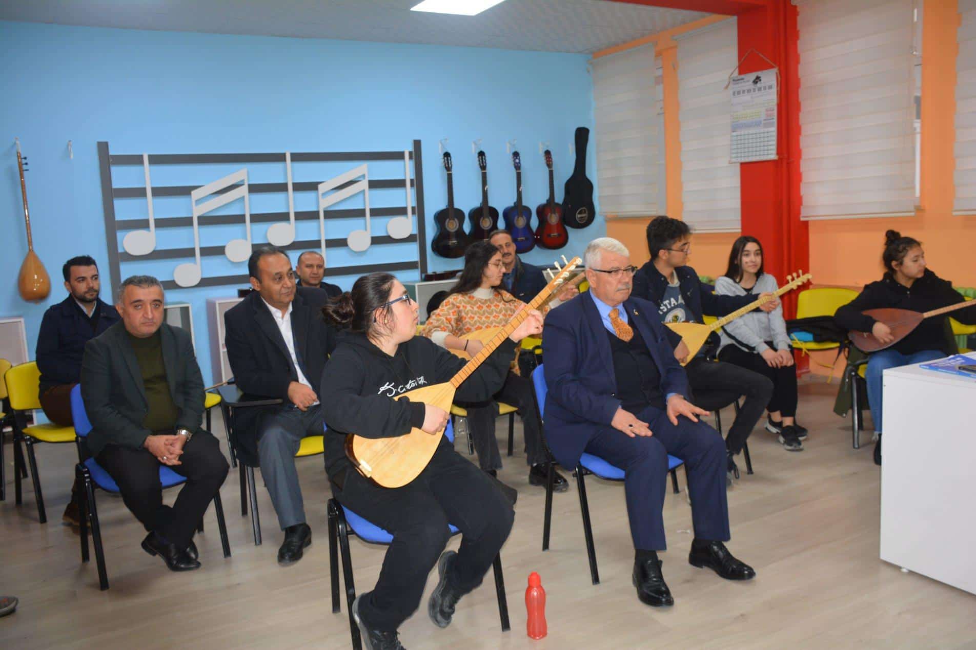 Okulun müzik atölyesinde açılan saz kursunda öğrencilerle bir araya gelen Yazıcı, öğrencilerin seslendirdiği şarkı ve türkülere eşlik ederek teşekkür etti.