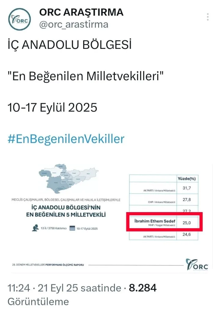Milliyetçi Hareket Partisi (MHP) Yozgat Milletvekili İbrahim Ethem Sedef, ORC Araştırma Şirketi tarafından düzenlenen bir ankette, 13 ilde 3 bin 750 katılımcının görüşleri doğrultusunda İç Anadolu Bölgesi’nin en beğenilen 5 milletvekili arasında yer aldı.