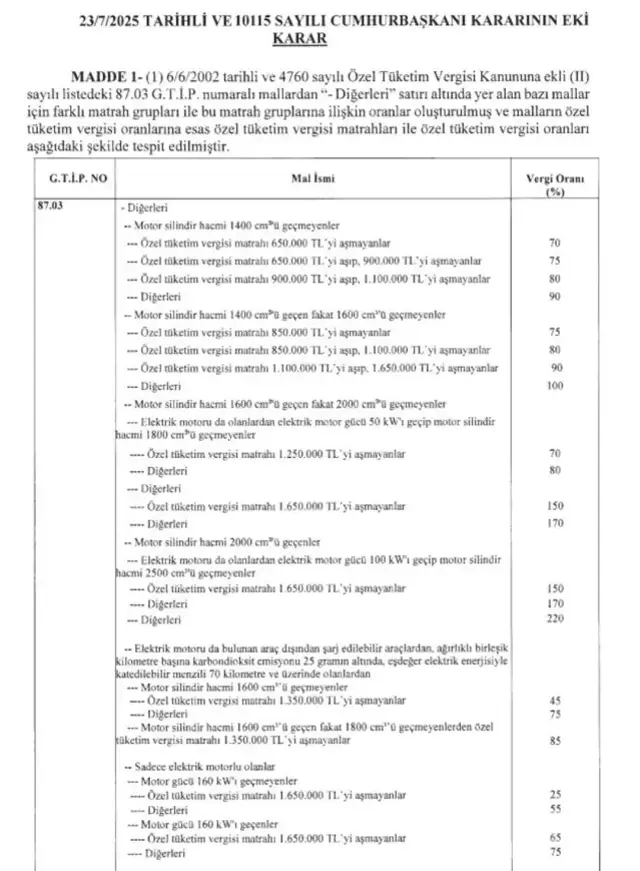 Yeni düzenleme ile birlikte, elektrikli otomobillerde en düşük ÖTV oranı yüzde 25 olarak belirlendi. Şarj edilebilir hibrit araçlarda oran yüzde 45, diğer hibritlerde ise yüzde 70 oldu. İçten yanmalı motorlu otomobillerde ise oranlar yüzde 70’ten başlayıp yüzde 220’ye kadar çıkıyor. Pick-Up tarzı araçlarda ÖTV oranı yüzde 4’ten yüzde 50’ye yükseldi.