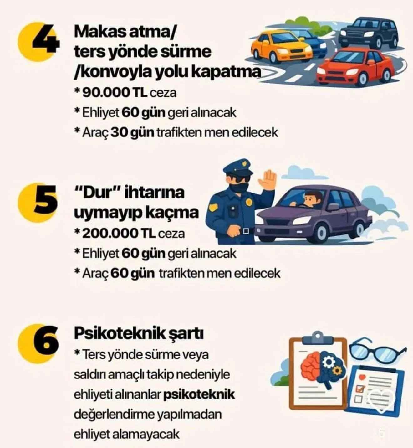 Trafikte saldırgan davranışlar ve yol güvenliğini tehlikeye atan hareketler için de ağır yaptırımlar getirildi. Özellikle konvoy yaparak trafiği engelleyen sürücülere 90 bin lira idari para cezası uygulanacak, sürücü belgelerine 60 gün süreyle el konulacak ve araçları 60 gün süreyle trafikten men edilecek.