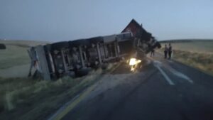 Yozgat’ta akşam saatlerinde meydana gelen kazada, buğday yüklü bir tırın devrilmesi sonucu dorsede bulunan buğdaylar