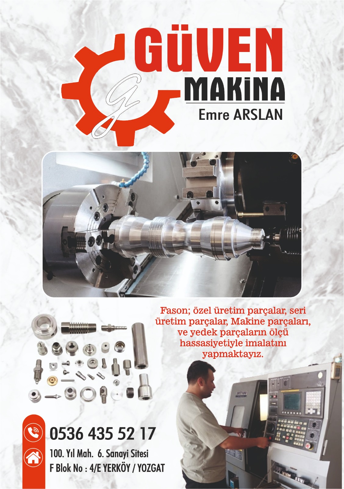 Firma sahibi Emre Arslan’ın liderliğinde, fason üretim, özel üretim parçalar, seri üretim parçaları, makine parçaları ve yedek parçaların imalatını büyük bir titizlikle ve yüksek ölçü hassasiyetiyle gerçekleştiriyor. Sektördeki deneyimi ve uzmanlığıyla öne çıkan Güven Makina, yerel ekonomiye önemli katkılarda bulunurken, aynı zamanda ulusal pazarda da kendine sağlam bir yer edinmiş durumda.