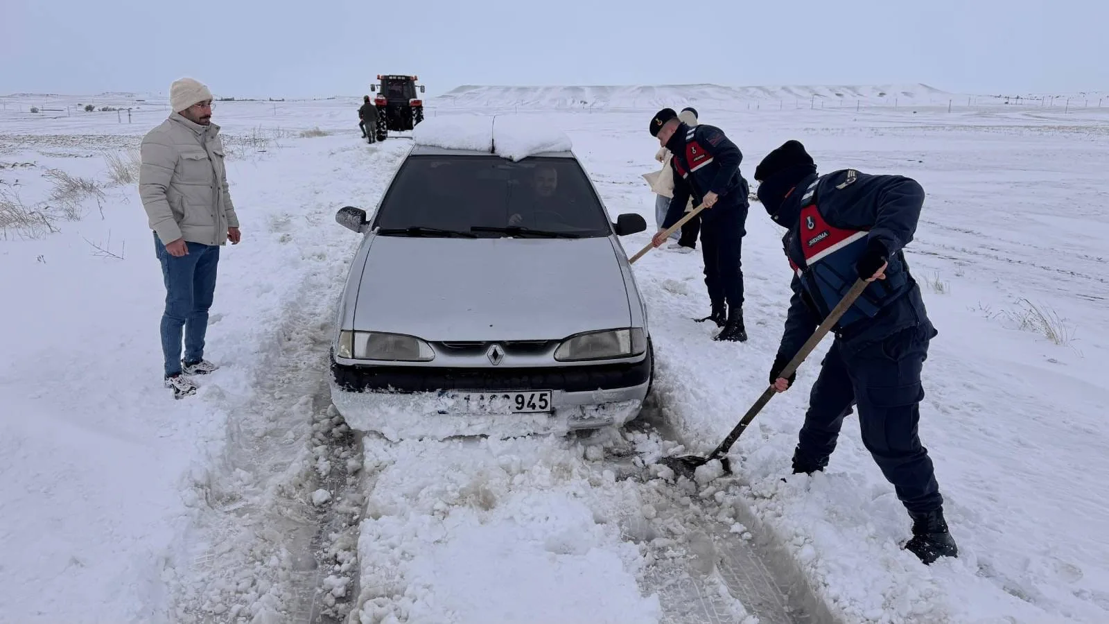 Yenifakılı ilçesi Merkez Jandarma Karakol Komutanlığı sorumluluk alanındaki Eskiören-Merdaneli köy yolunda etkili olan yoğun kar yağışı nedeniyle 51 ACK 945 plakalı bir araç yoldan çıkarak kara saplandı.